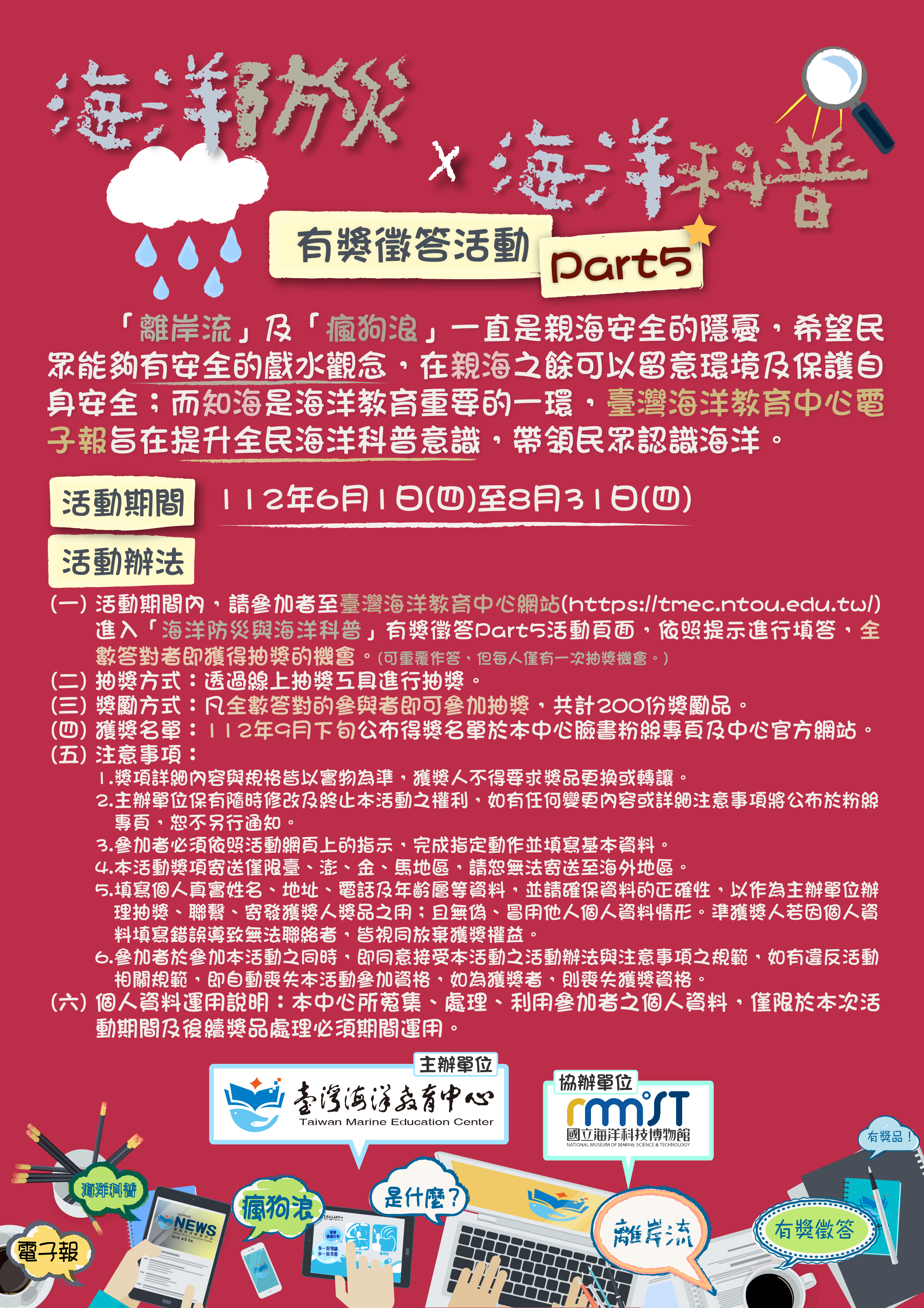 本年度辦理「海洋防災與海洋科普有獎徵答活動Part5」,以達到傳播與推廣海洋教育之成效,歡迎大家共襄盛舉。