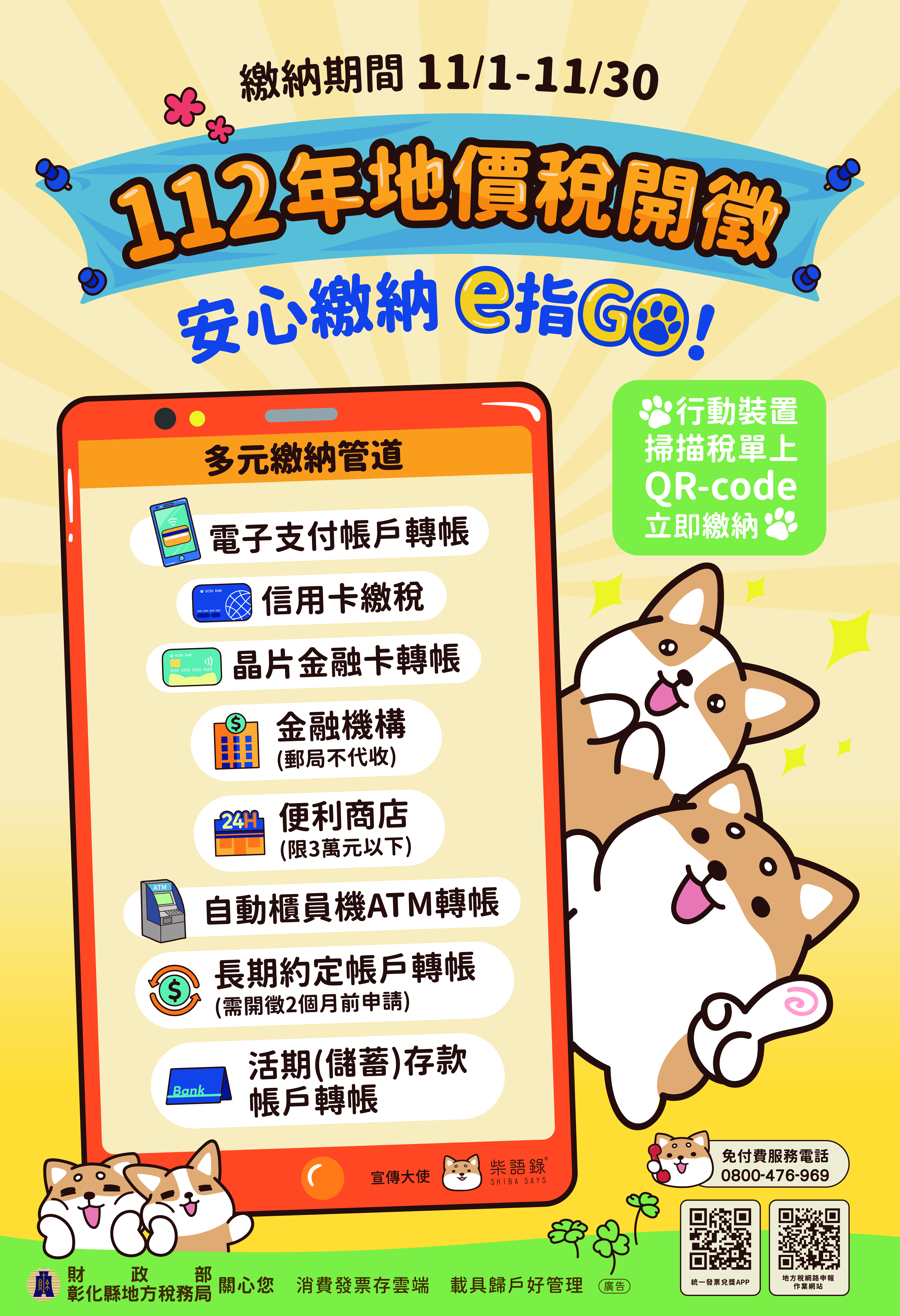 託播內容:112年地價稅於11月開徵,繳納期間自11月1日至11月30日,請如期繳納,彰化縣地方稅務局關心您。