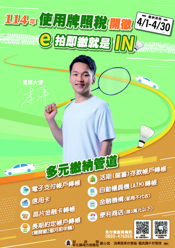 託播內容:114年使用牌照稅於4月開徵,繳納期間自4月1日至4月30日,請如期繳納,彰化縣地方稅務局關心您。